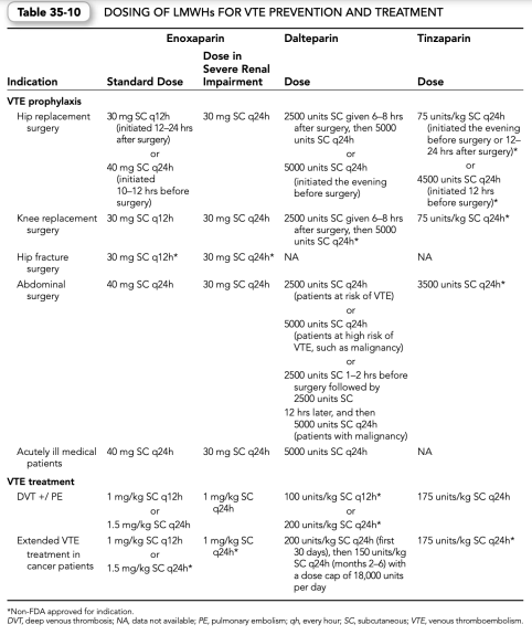 a. Dosing of LMWHs is disease state and product specific; different doses are administered based on the indication for use and the manufacturer of the specific LMWH. Table 35-10 shows manufacturer’s suggested, U.S. Food and Drug Administration (FDA) approved dosing for specific indications.