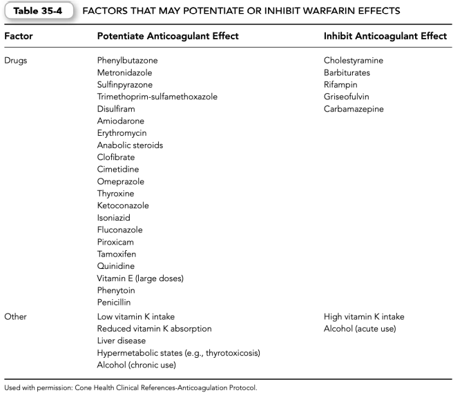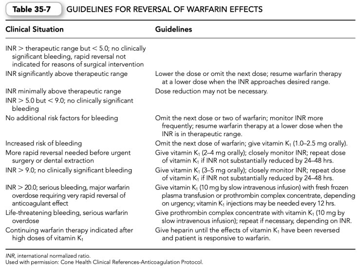 f. Reversal of warfarin effects may be necessary owing to an elevated INR or bleeding complications associated with oral anticoagulant therapy (Table 35-7).
