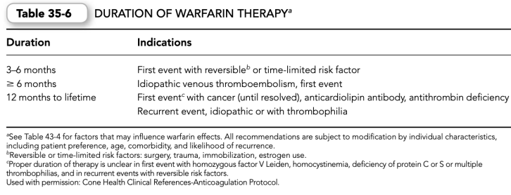 e. The duration of warfarin therapy depends on each patient’s indication(s) for use (Table 35-6).