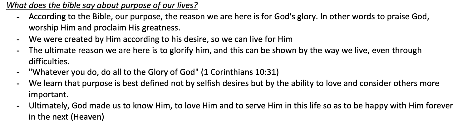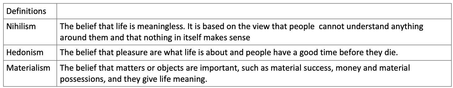 Religion- A system of beliefs, including belief in the existence of a higher being. A religion is a set of beliefs and practices and are often organised around a supernatural being. It is expressed through worship, and prayer, and has values. It involves community.