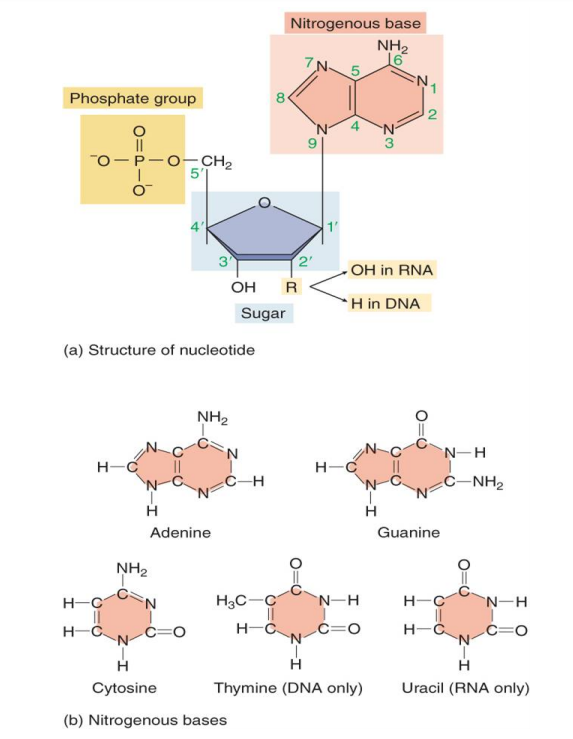 - 1 nucleotide = phosphate group, pentose and nitrogen containing base