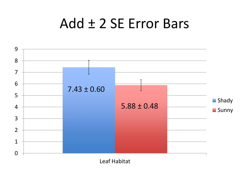 Analyze null hypothesis: Because the ±2SE error bars overlap, then there is not a significant difference between the data points. We fail to reject the null hypothesis.