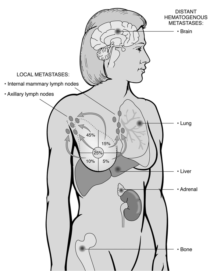 The cancer may have spread to axillary lymph nodes or to lymph nodes near the breastbone.