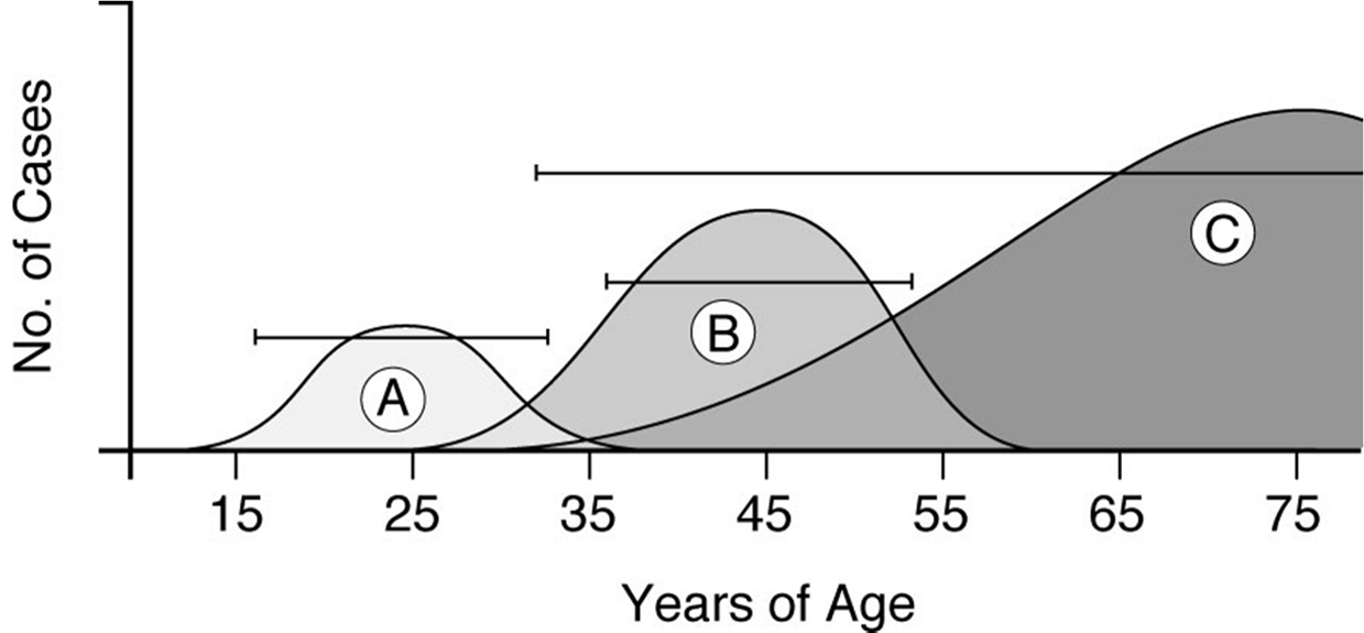 The incidence of various breast diseases varies with age, as depicted in epidemiological curves, showing patterns of increase and decrease across different age groups (e.g., peak incidence for some diseases between approx. 45 and 65 years of age).