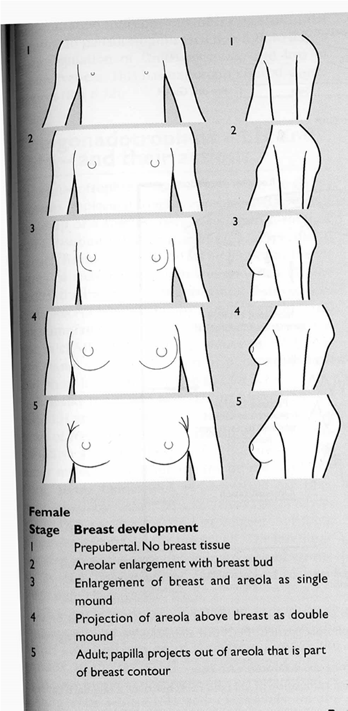 Stage 5: Adult stage; the papilla (nipple) projects out of the areola, which becomes part of the overall breast contour.