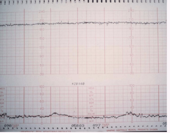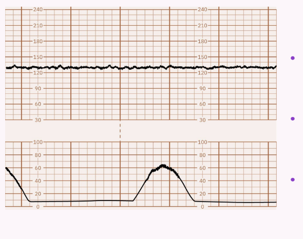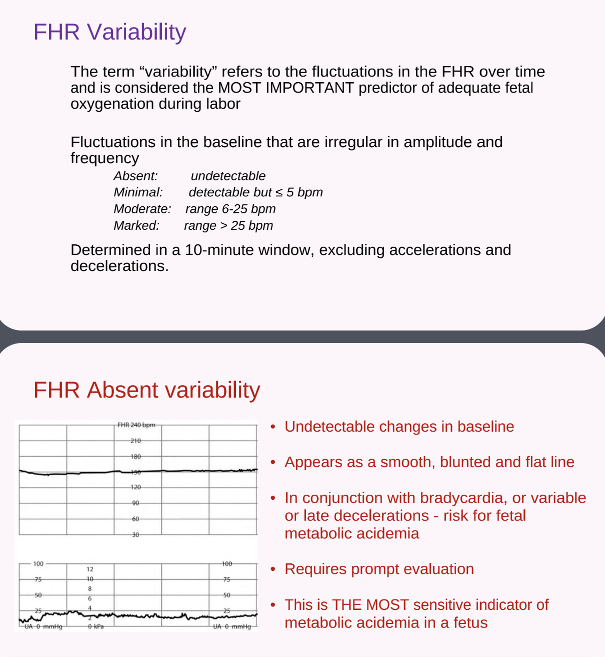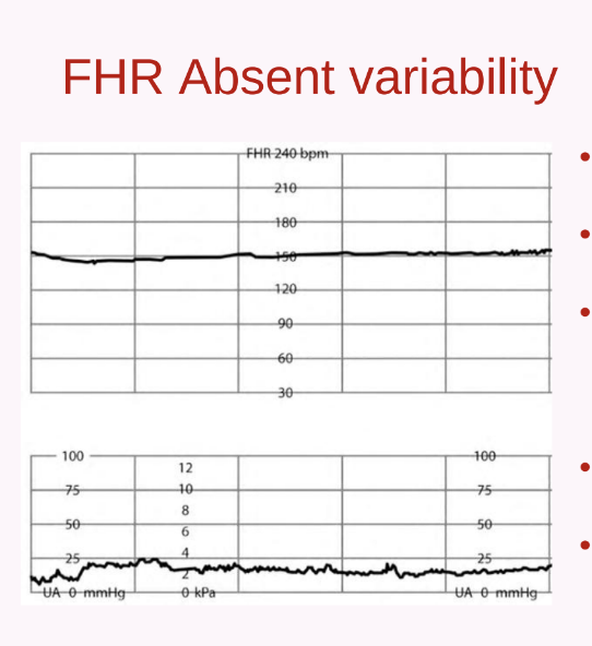 Absent Variability: No detectable changes in fetal heart rate; typically associated with fetal distress and requires immediate evaluation. NEVER WANT TO SEE STRAIGHT LINES!!!!!