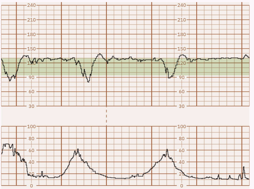Category I (Normal): Baseline bpm, moderate variability, no late or variable decelerations, accelerations present/absent, early decelerations present/absent