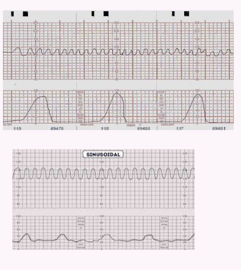 Sinusoidal Pattern: A smooth, sine wave-like undulating pattern ( cycles/minute for minutes) without accelerations; very concerning.