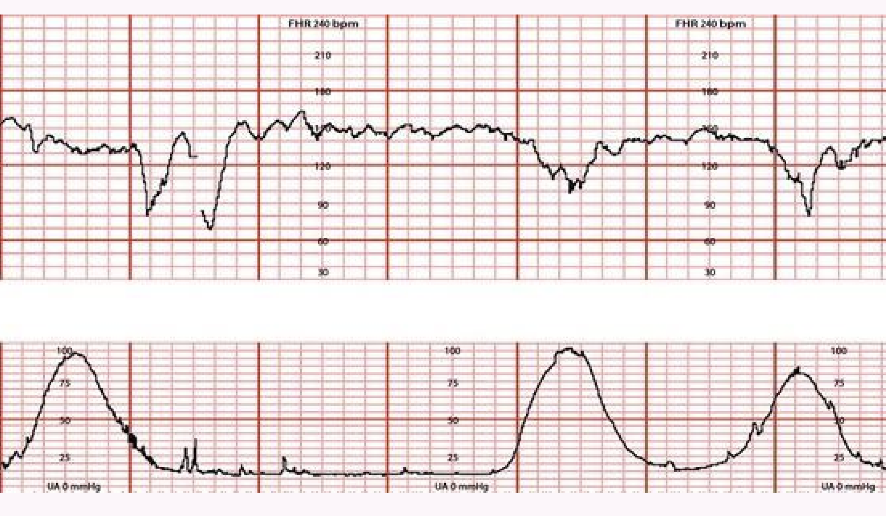 Category II (Indeterminate): Characteristics not Category I or III ; may include baseline heart rate between bpm with decreased variability, variable decelerations that are intermittent, and/or transient late decelerations.
