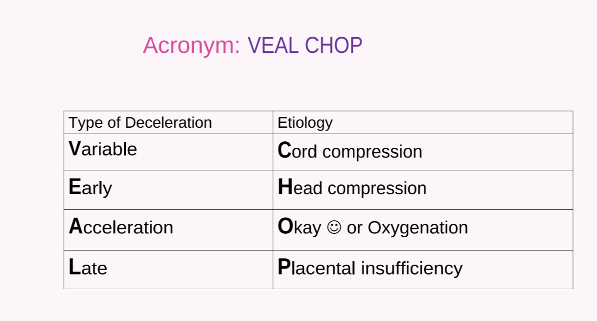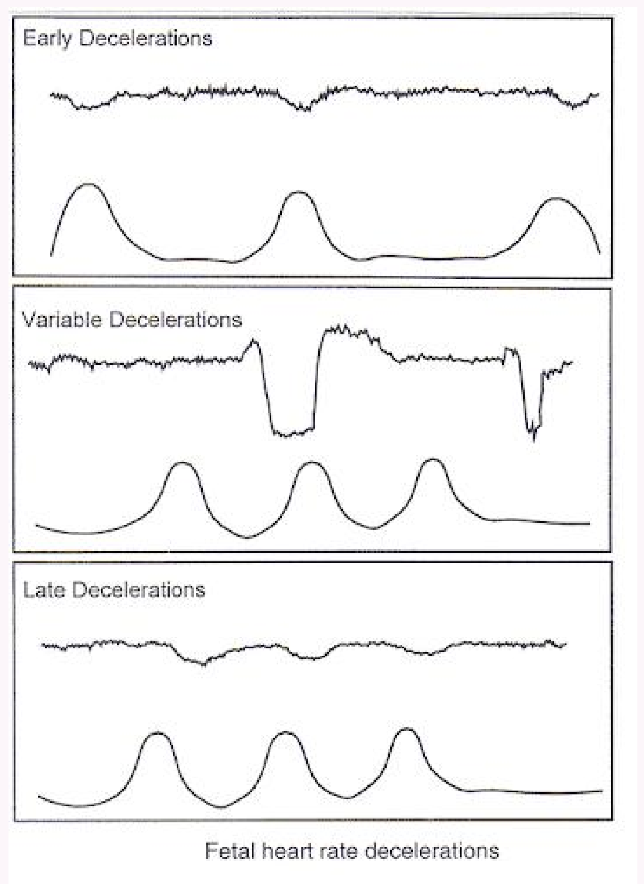 Late: Placental insufficiency; gradual decrease/return, occurs after peak of contraction.