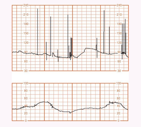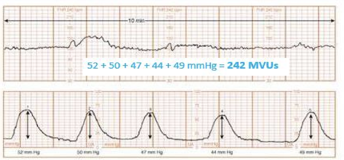Montevideo Units (MVUs): Quantifies uterine activity with an IUPC; sum of (peak intensity - resting tone) for contractions over minutes. Adequate labor: MVUs.