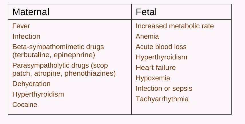 Tachycardia: Baseline > 160 bpm for > 10 minutes; common causes include maternal fever, medications.