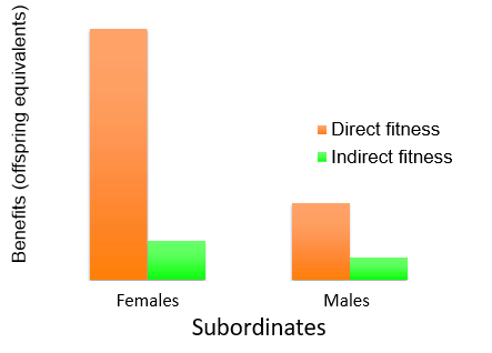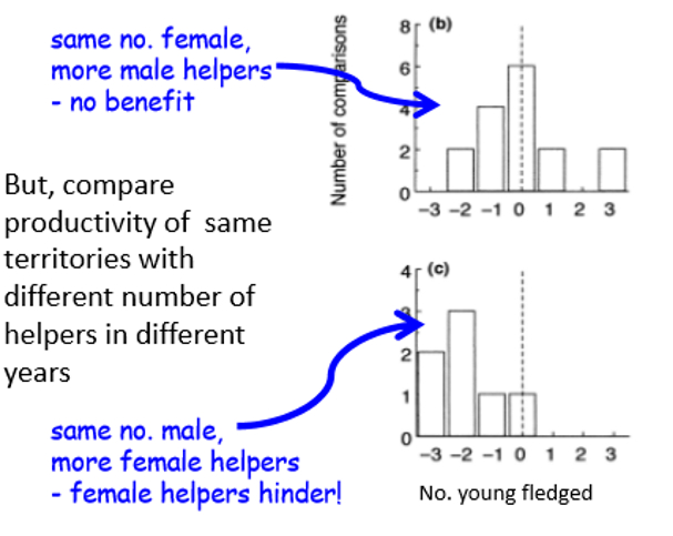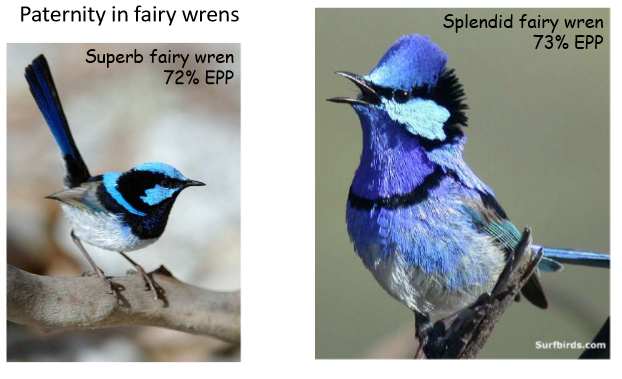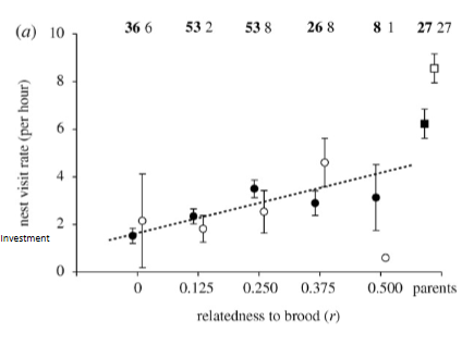 calculated indirect fitness in wrens and found high levels of extra pair paternities→ males and helpers have low relatedness to the offspring