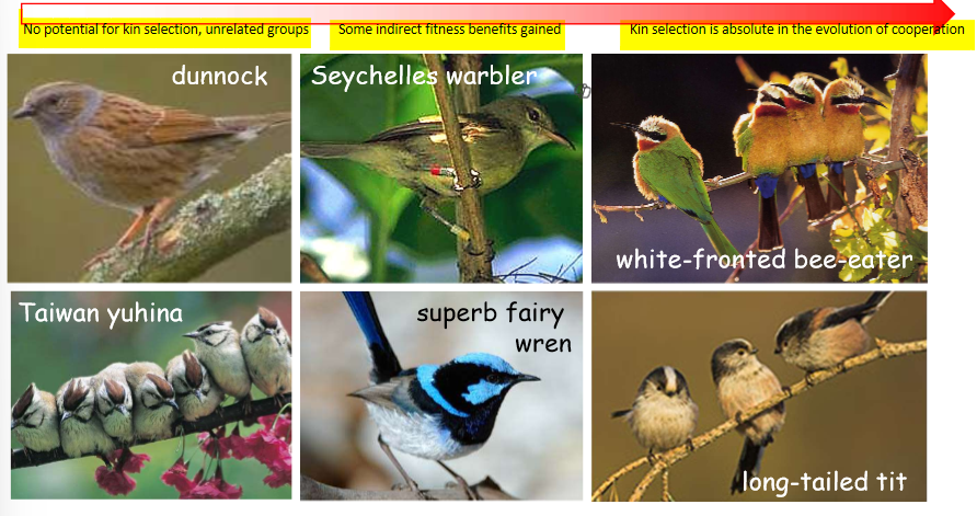 Kin selection has variable importance in the evolution of cooperation across species e.g. birds: