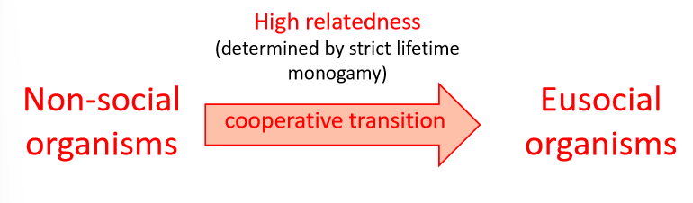 → transition to eusociality was driven by high relatedness determined by strict lifetime monogamy: