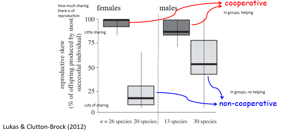 in cooperative groups, there is nearly 100% reproductive skew, where reproduction is monopolised by 1 male and1 female, high relatedness in these groups
