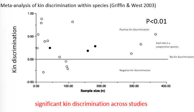 → good comparative and meta-analysis evidence for active kin discrimination