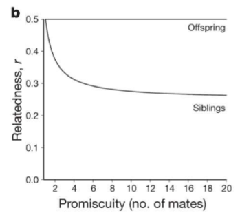 monogamy hypothesis→ strict lifetime monogamy results in individuals with equal relation to their offspring and their siblings (r = 0.5)