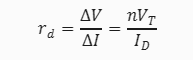 where ΔV and ΔI are the small changes in the diode voltage and current due to the AC signal, n is the ideality factor of the diode, VT is the thermal voltage, and ID is the DC diode current.