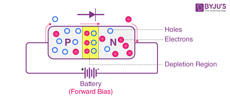 Under forward bias, the electric field created by the applied voltage assists the majority charge carriers (holes in the P-type and electrons in the N-type) in moving towards the junction. In other words, the applied voltage reduces the potential barrier at the junction, allowing the charge carriers to overcome it and cross from one side to the other. As electrons move from the N-type to the P-type and holes move from the P-type to the N-type, they recombine near the junction. This process leads to the creation of a region near the junction with reduced charge carriers, known as the depletion region. As a result, the depletion region at the junction becomes narrower, reducing the barrier for the flow of charge carriers.