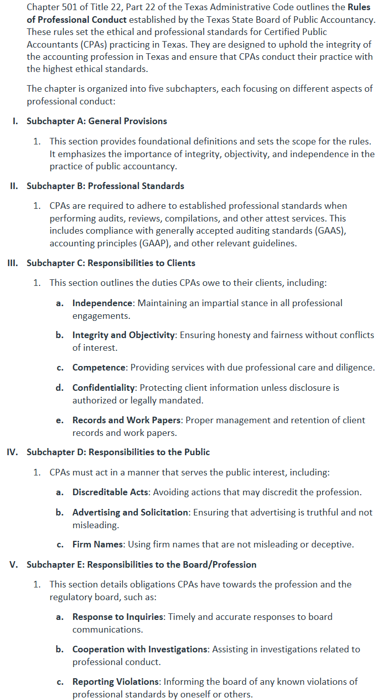 Chapter 501 of Title 22, Part 22 of the Texas Administrative Code outlines the Rules of Professional Conduct established by the Texas State Board of Public Accountancy. These rules set the ethical and professional standards for Certified Public Accountants (CPAs) practicing in Texas. They are designed to uphold the integrity of the accounting profession in Texas and ensure that CPAs conduct their practice with the highest ethical standards.