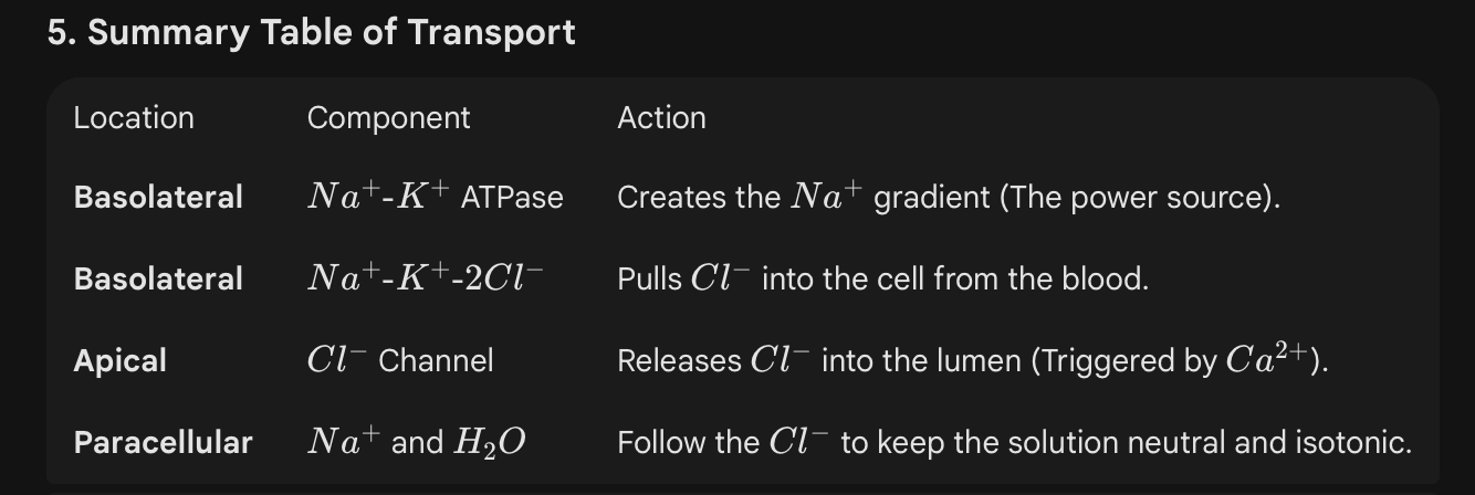 Chloride Accumulation: This causes Cl− to accumulate inside the secretory cell far above its equilibrium point.