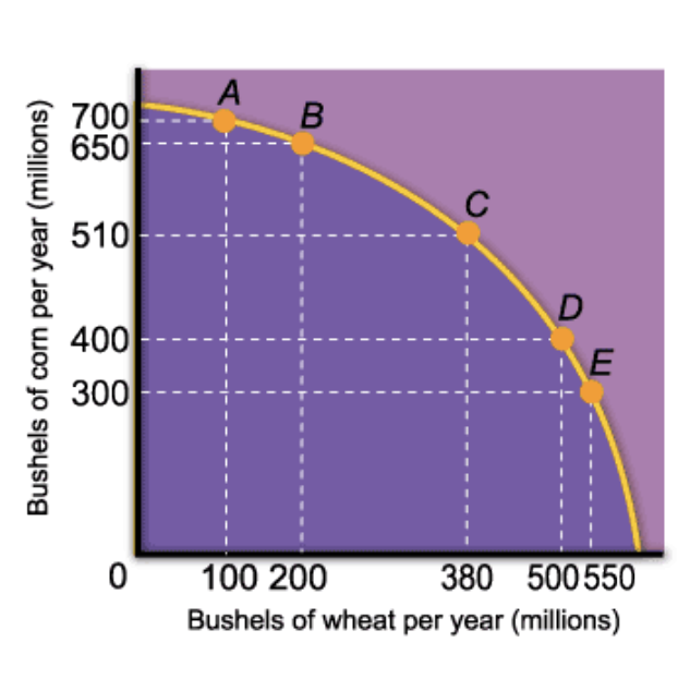 Law of Increasing Opportunity Cost: The concave shape of the PPF shows that as output of one good increases, increasingly more of the other must be sacrificed.