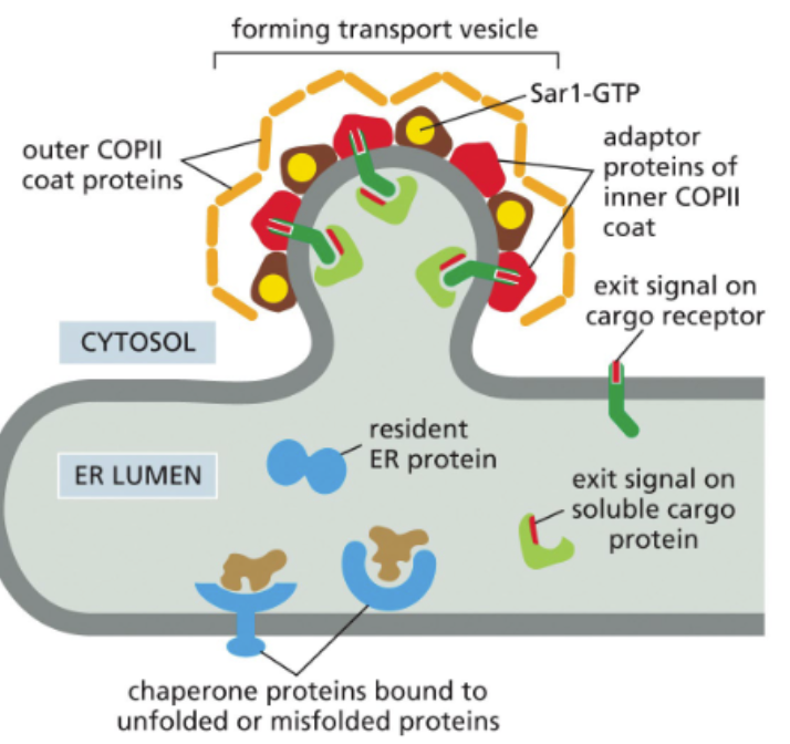 proteins need to be correctly folded and all units assembled in multi-unit proteins (quaternary structure) before departure - prevents misfolded proteins from moving forward