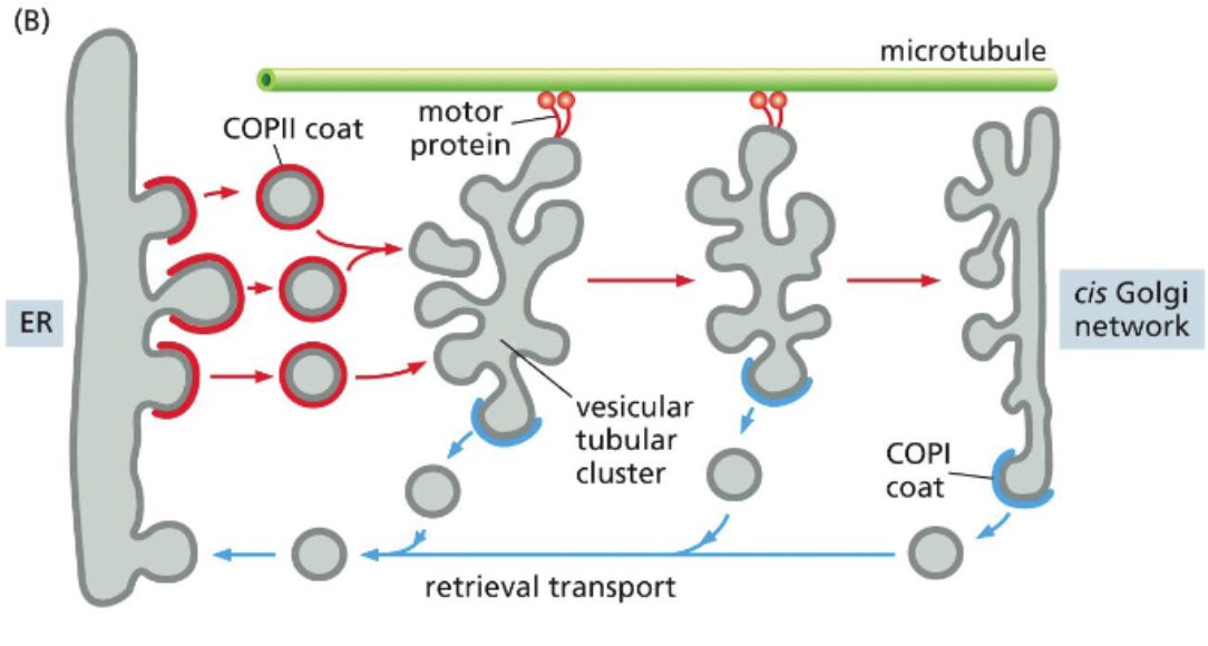 vesicular tubular structure travels along microtubules to fuse with the Golgi