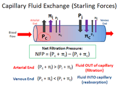 Arterial end: Pc is high and higher than Πc so there's a net force for efflux. Fluid/oxygen/etc is pushed out into the organ