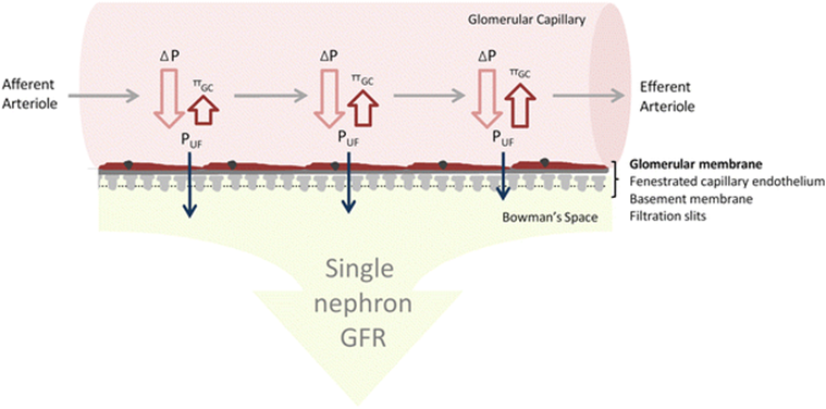 In a glomerular capillary, the Starling's forces are positive for efflux all the way along in order to keep fluid moving out of them.