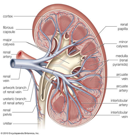 Kidney: artery -> arterioles -> capillaries -> more arterioles