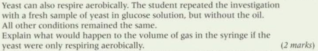 The volume stays constant, since the volume of carbon dioxide released is equal to the volume of oxygen absorbed. => equation for respiration, since question is respiration.