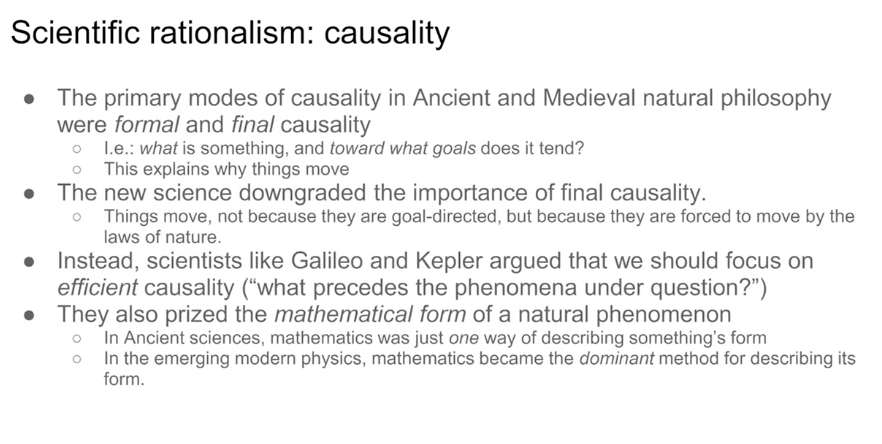 Central tenet of the new science: knowledge of the natural world is based on the ability to identify mathematically clear laws that govern mechanical interactions among material things