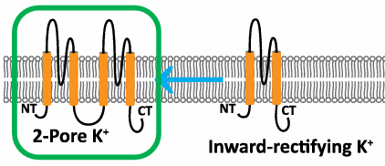 2 Transmembrane Helices (TMHs) separated by an extracellular P-loop.