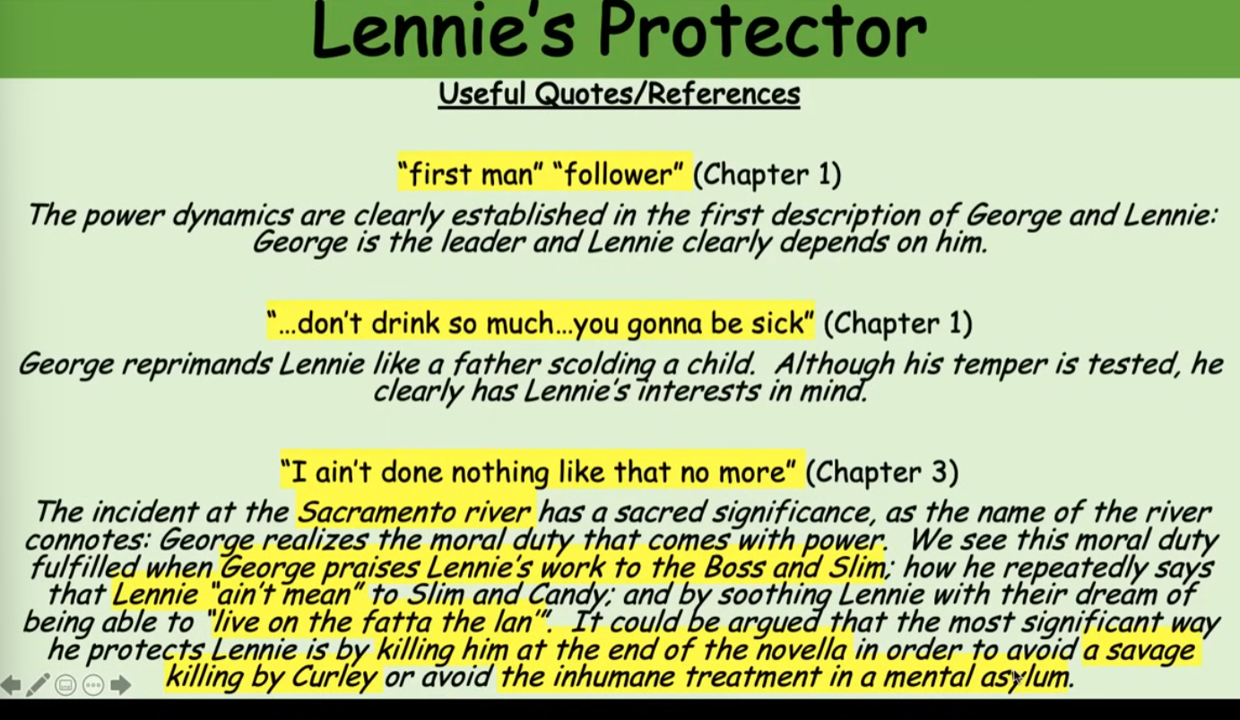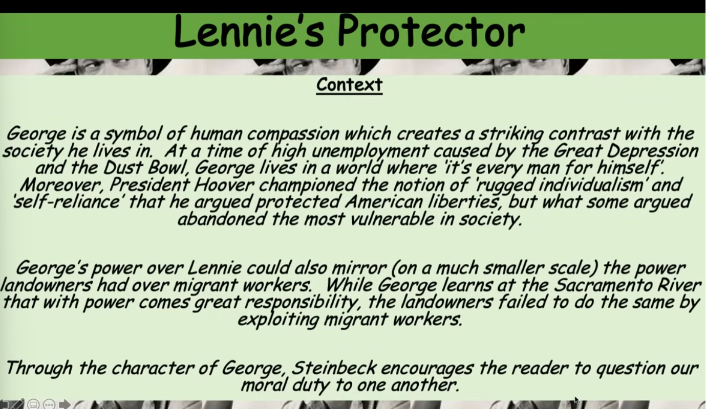 George id described as the “first man” and Lennie the "follower”, we immediately learn the power dynamics, George aims to protect Lennie and look after him. George acts as a father, an example would be when he says “don’t drink so much…you gonna be sick”, he scolds him like a child, even when his temper is testes its Lennie’s interests that he has in mind. Whilst talking to Slim he reveals that he wasn’t kind to him as a child and he explains how he deeply regretted his actions as Lennie was so kind towards him. George says “I ain’t done nothing like that no more”, this occurred at the Sacramento river, the word sacrament means sacred significance. Steinbeck is painting this moment as significant, where George realises the moral duty that come with power. He has power over lennie as his much more intelligent and he realises that Lennie is vulnerable and he need to take care of him.