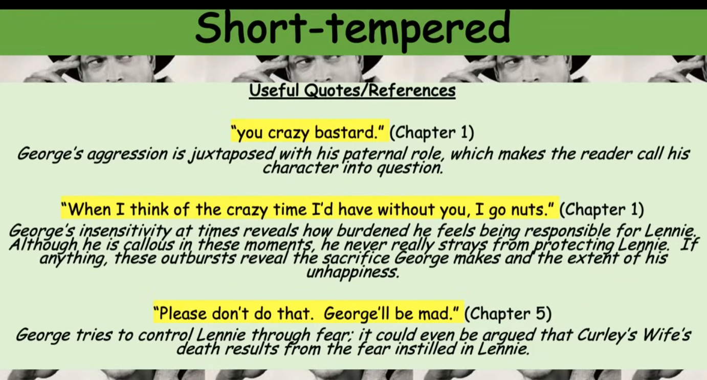 George can be quite mean, for example when he calls Lennie a “crazy bastard”, his aggression juxtaposes with the paternal role he takes on. Then he goes on about the best life he would have without him in the quote “when i think of the crazy time I’d have without you, I go nuts”, really shows George’s insensitivity.