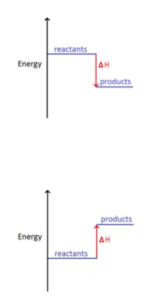 In these diagrams , when a reaction is exothermic the enthalpy change is negative so the products line is below the reactants as energy has been given out