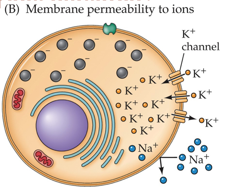 Selective permeability – membrane at rest lets \text{K}^+ (Potassium) move more freely than \text{Na}^+ (Sodium)