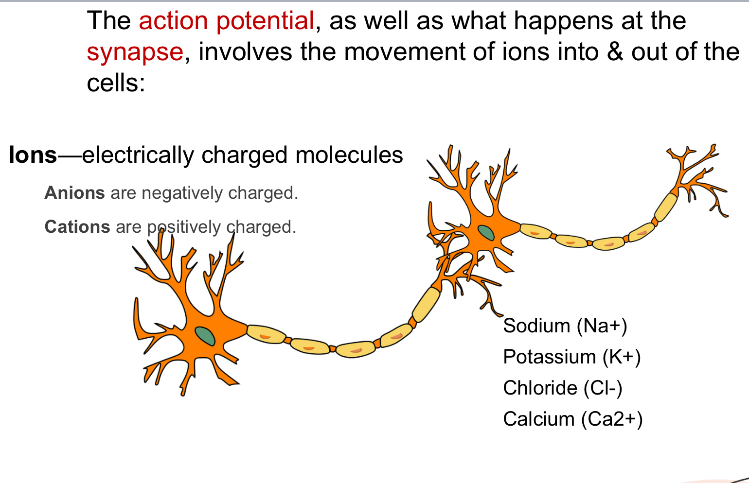 Action potential begins with sodium ions Na+ flowing into neuron