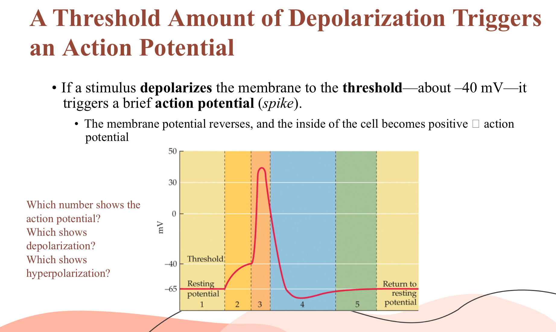 Threshold – critical V_m \approx -40\;\text{mV} that triggers an action potential