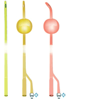 Catheters come in many different sizes and materials (latex, silicone). A client's size, age, pathology, and potential allergies to materials are all considerations when selecting a catheter. Indwelling, retention, coudé, and suprapubic catheters have a small balloon at their tips to keep them in place. Balloon and catheter sizes also vary and are chosen based on the client's age and size and the clinical indications for catheterization. Always use sterile saline to inflate catheter balloons. Whether the balloon inflation should be pretested varies with the manufacturer's recommendations. Evidence suggests that testing the balloon may lead to integrity compromise and failure.