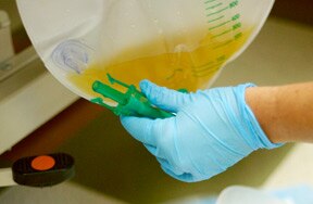 On the opposite end of the collection bag near the bottom is a port for emptying the bag. Most bags have some type of drain valve in place to prevent leaks. To drain urine from the collection bag, open the drain valve and allow the urine to flow into a urinal, basin, or measuring container. Then, flush the urine down a toilet.