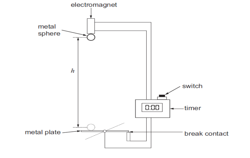 When the switch is pressed it disconnects the electromagnet releasing the metal sphere. At the same instant, the timer starts. When the sphere hits the magnetic switch it breaks the circuit stopping the timer, thus recording the time it takes for the sphere to fall through a height, h. The time taken for the ball bearing to fall through a range of different heights needs to be measured. Plot a graph of height, h, (y-axis) against time squared, t 2 , (x-axis) and calculate the value of g using: g = 2 × gradient.