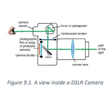 As illustrated in Figure 9.1, DSLR cameras use convex lenses where light rays pass through. These light rays are directed towards the slanted mirror located near the camera shutter, and then reflected from a translucent screen projected to another mirror until it reaches the viewer’s eye. Through this, the photographer will be able to see what he is capturing.