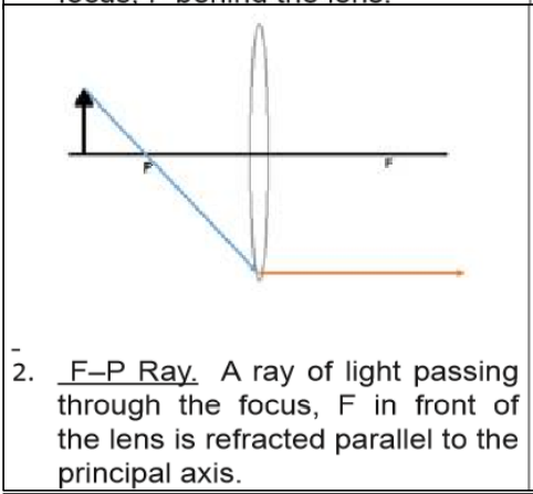 - From the object, draw the first ray (P–F ray). From the same point on the object, draw the second (F–P ray), and third (V ray) rays.