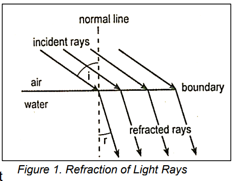 the path of light is reversible. thus, when light passes from water to air, it speeds up. the refracted ray bends away from the normal line and angle of incidence (∠i) is less than the angle of refraction (∠r)