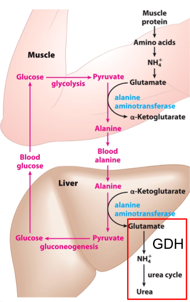 Ammonia from the deamination of glutamate (via GDH) enters the urea cycle and is excreted.