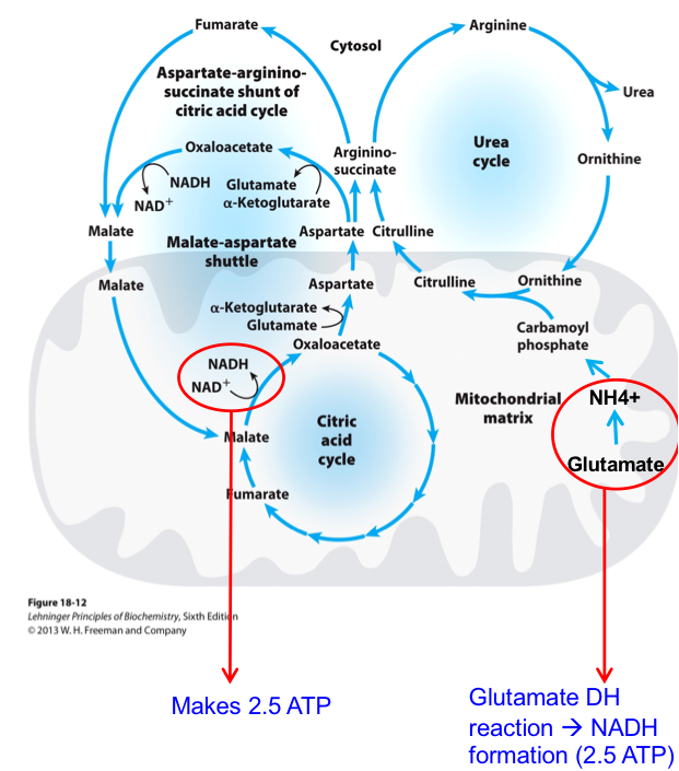 Glutamate dehydrogenase reaction produces NADH for ATP → 2.5 ATP molecules