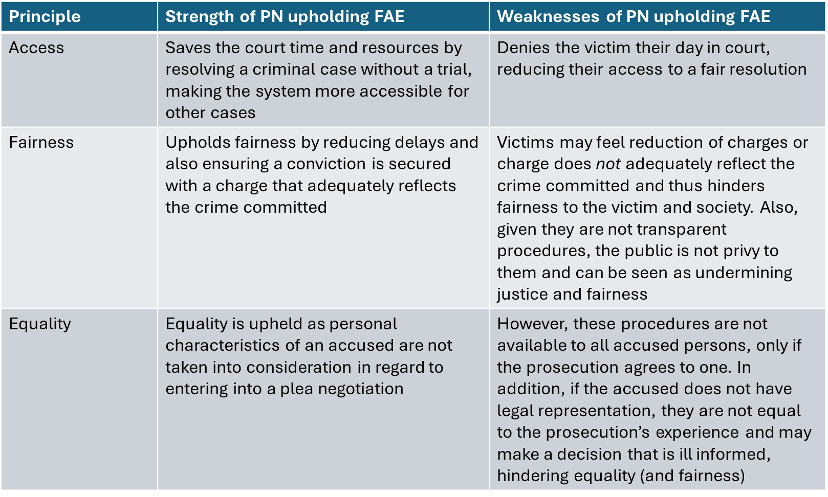 Fairness | Upholds fairness by reducing delays and also ensuring a conviction is secured with a charge that adequately reflects the crime committed | Victims may feel reduction of charges or charge does not adequately reflect the crime committed and thus hinders fairness to the victim and society. Also, given they are not transparent procedures, the public is not privy to them and can be seen as undermining justice and fairness |